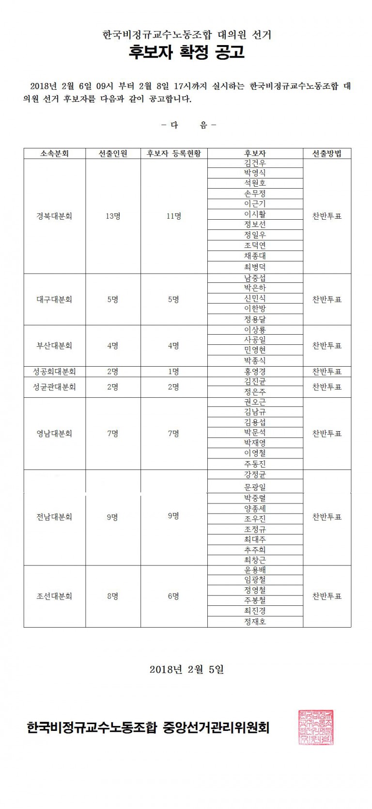 한국비정규교수노동조합 대의원선거 후보자 확정 공고