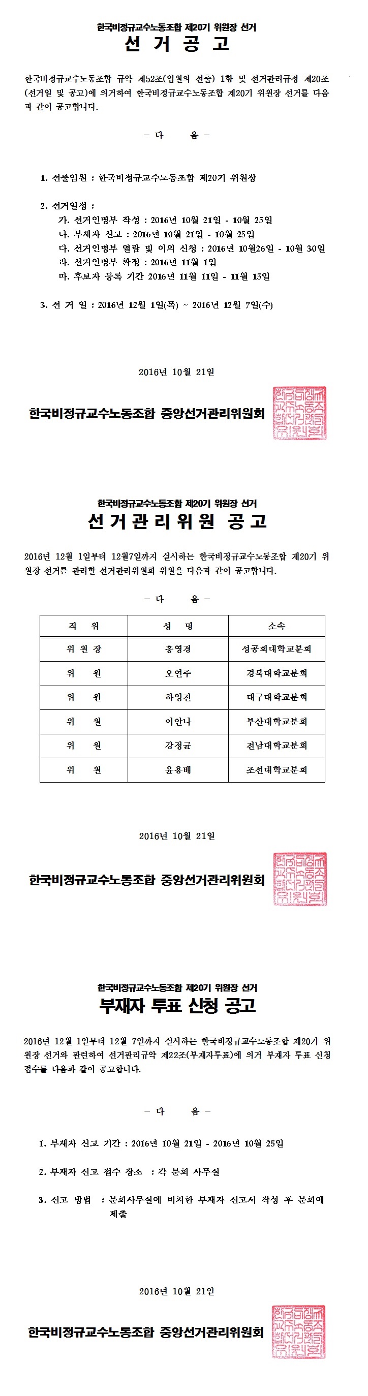 한국비정규교수노동조합 20기 위원장 선거 공고 페이지 정보 작성자 관리자 작성일16-10-20 19:44 조회8,378회 댓글0건 이전글 다음글 목록 본문 한국비정규교수노동조합 20기 위원장 선거 공고 추천 0 댓글목록 등록된 댓글이 없습니다. 이전글 다음글 목록