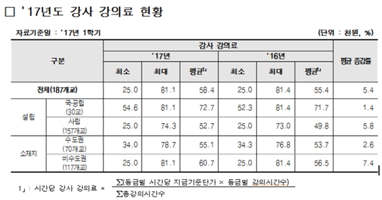 교육부와 한국대학교육협의회가 30일 대학알리미(www.academyinfo.go.kr)에 공시한 바에 따르면 올해 국·공립대학의 강사 강의료 평균은 7만2700원으로 전년(7만1700원) 대비 1000원(1.4%) 상승했으며, 사립대학은 5만2700원으로 전년(4만9800원) 대비 2900원(5.8%) 상승했다.