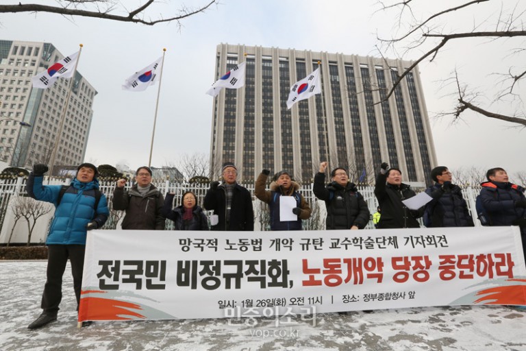 '민주화를위한전국교수협의회' 등은 오늘 서울 정부종합청사 앞에서 기자회견을 열고, 정부가 강행하는 노동법 개정이 대다수 국민의 삶을 더욱 불안하게 만들어 일상적 위기와 파탄으로 몰아간다고 비판했습니다.
