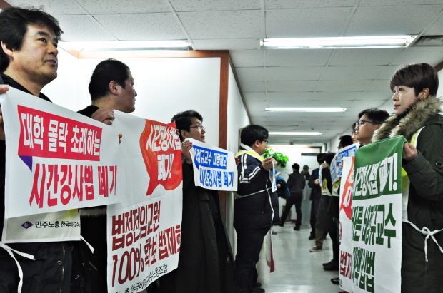 ‘강사법’ 시행 20여 일을 앞두고(2016년 1월 1일 시행) 시간강사들이 야당당사 항의농성에 돌입했다. 한국비정규교수노동조합(위원장 임순광, 비정규교수노조) 조합원 10여 명은 7일 오후 2시 서울 여의도 새정치민주연합 당사 사무실 복도에서 “즉각적인 강사법 폐기와 2016년 안에 국회 상임위에 ‘비정규교수특별위원회’를 설치하고, 강사지원 예산을 조속히 배정할 것”을 촉구했다.