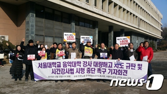 민주노총 한국비정규교수노동조합과 서울대학교 음악대학 성악과 강사들은 22일 오전 관악구 교내 중앙도서관 앞에서 기자회견을 열고 시간강사법에 의거해 대량 해고를 시도하고 있는 학교측에 강사대량해고와 신규채용 시도를 즉각 중단하라고 촉구했다.