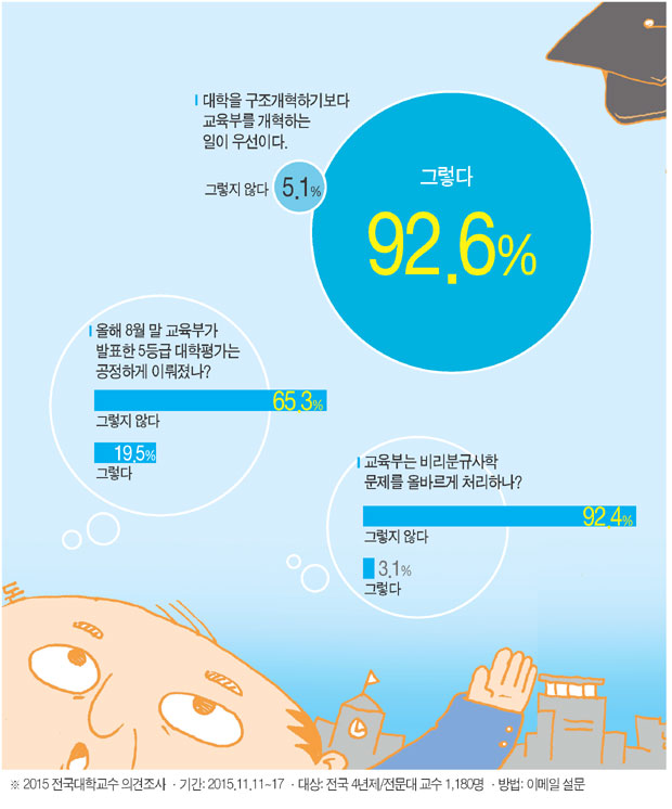 <교수신문>이 지난 11일~17일 일주일간 전국 4년제·전문대학 교수 1천180명(전임 757명, 비전임 423명)을 설문한 결과 92.6%(1천92명)가 “대학개혁보다 ‘교육부개혁’이 우선돼야 한다”고 응답했다. 설문에 응답한 교수들은 교육부가 대학을 재정지원과 연계한 각종 평가로 묶어두면서 일부 대학의 주요 보직에 교육부 출신의 ‘낙하산 인사’를 강행한 데 따른 비판적 시각을 내보였다.