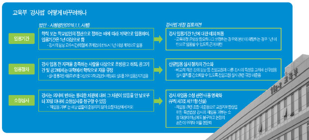 교육부가 내년 1월 1일부터 시행될 ‘강사법’(고등교육법 일부 개정법률)과 관련, ‘강사법 개정 검토의견’(검토의견)을 국회 교육문화체육관광위원회(교문위) 위원장에게 전달한 사실이 드러났다. 이 문건엔 강사법을 이전의 시간강사 채용제도로 되돌리려는 내용이 담겨 있어 파장이 예상된다.