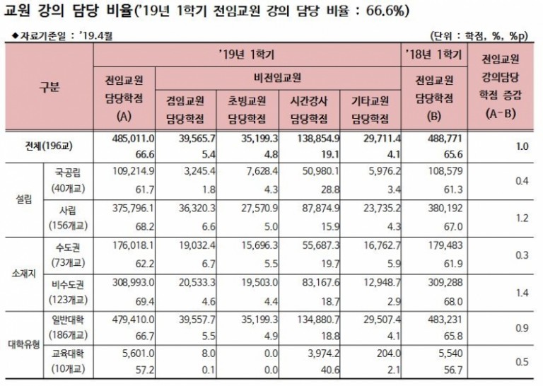 8월 강사법 시행에 앞서 시간강사 해고 사태가 현실화되고 있다. 총 강좌 수가 축소되고, 전임교원 강의 담당 비율이 증가한 것. 대학들이 시간강사를 해고하면서 강좌를 통·폐합하거나 시간강사 대신 전임교원에게 강의를 부여했다는 분석이 나오고 있다.