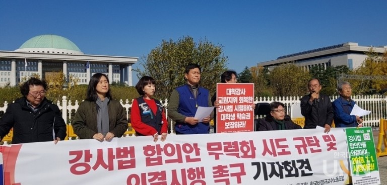 비정규교수노조는 “교육의 질이 떨어진다면 그건 강사법을 핑계로 대학이 구조조정을 하기 때문”이라며 “비용 부담도 얼마 되지 않고 대학이 충분히 감내할 수 있음에도 불구하고 정부가 지원까지 어느 정도 하겠다는데 대학이 이러는 것은 다른 이유가 있어서다. 바로 대학 전체에 들어가는 인건비 절감과 교원통제를 위해서다”고 밝혔다.